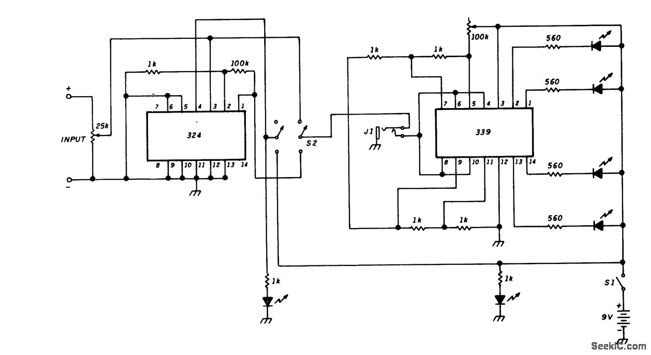 This circuit uses a dc amplifier (324) in a bar-graph circuit that uses an LM339 Quad comparator IC to sense dc levels.The LEDs will light every 100 mV.The 324 op amp is configured to provide a gain of 100×to increase this sensitivity to 1 mV.Two auxiliary LEDs indicate power on and ×100 gam setting.
