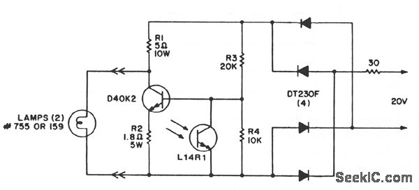 This circuit provides a very low cost method of controlling light levels. Circuit power is obtained from a relatively high source impedance transformer or motor windings, normally used to drive the low-voltage lamps used in these functions. It should be noted that the bias resistors are optimized for the 20-V, 30-Ω source, and they must be recalculated for other sources. The L14R1 is placed to receive the same ambient illumination as the display and should be shielded from the light of the display lamps. The illumination level of lighted displays should be lowered as the room ambient light dims, to avoid undesirable or unpleasant visual effects.