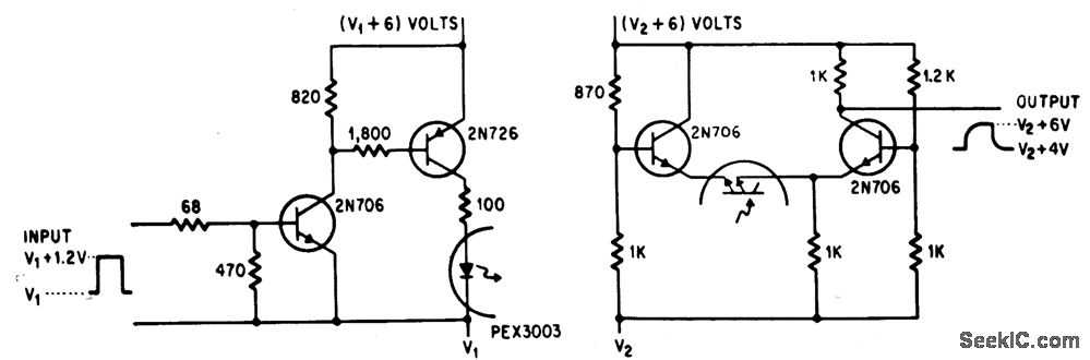 Gallium arsenide light source and silicon photodetector prevent interaction between drive circuit and output of binary switch.-E. L. Bonin, Light-Coupled Semiconductor Switch for Low-Level Multiplexing, Electronics, 38:3, p 54-59.