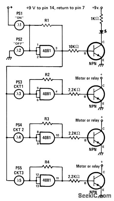 Battery-powered CM0S logic is switched on and off by aiming flashlight beam at photocell, for turning small motors of model train or other powered toy on and off. Transistors can be 2N2222A for most small motors, but larger motors will require power transistors, Use high-intensity flashlight, with shield over lens to restrict beam width, so only one of five photocells is illuminated at a time. LED shows ON/OFF status of circuit. Values of R1-R4 are chosen so each gate flips logic state only when associated photocell is illuminated.-J. Sandler, 9 Projects under $9, Modern Electronics, Sept. 1978, p 35-39.