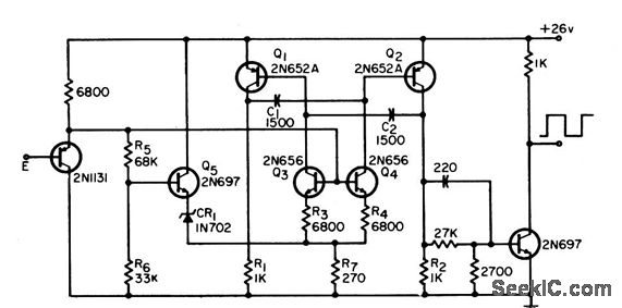 Adding emitter-followers to useable mvbr makes output frequency linear function (within 0.01%) of input voltage for 50% modulation above and below center frequency.-G. Richwell, Linear FM Modulator, EEE, 12:10, p 59-60.