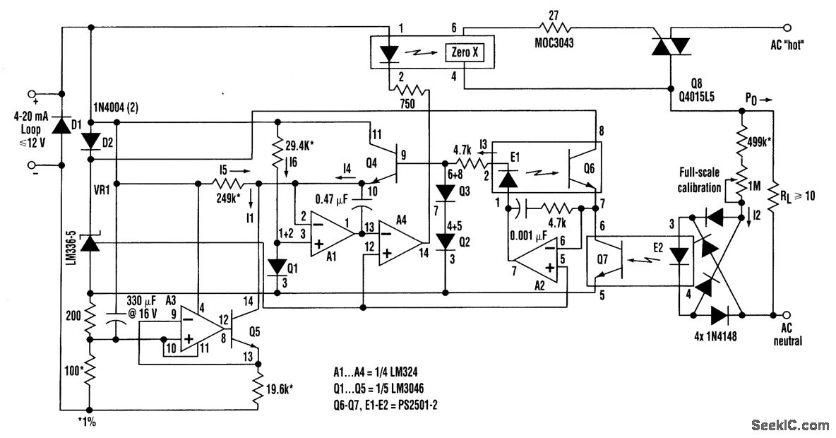 The power-control circuit shown outputs true-mean-square power in direct proportion to a 4- to 20-mA current-loop control input. The delivered power is tightly regulated, thus canceling line-voltage variations. In addition, it is proportioned on a fast 8.33-ms timebase, which avoids thermal ripple. The circuit operates as follows: 4- to 20-mA control inputs are converted by A3 and Q5 to negative 20 to 100μA (I1). I5 (fixed at±20 μA) zero-corrects I1, and the 0- to 80-μA difference is applied to the summing point of the A1 integrator. A4 compares the accumulated integral to a 2.5-V reference tapped from the ADJUST terminal of VR1 and, when the integral rises above that, it turns on the 3043 triac trigger optocouplen Zero-cross switching of the Q8 triac minimizes generated noise. Ac half-cycles through Q8 heat RI and push load-monitor current I2 through LED E2. To balance the resulting Q7 photocurrent, A2 produces I3, which causes matching conduction in the E1/Q6 optocoupler. Close tracking between sections of the 2501-2 dual optocoupler assures good proportionalitybetween I2 and I3 Because I3 also biases series-connected Q2 and Q3, voltage applied to the base of Q4 will be 2[X log (Y×I2)+Z], where X and Z are constants common to all five transistors in the 3046 monolithic array, and Y is set by the Fullscale Cal pot. As a result, antilog transistor Q4's emitter current is closely given by (Y ×12)2/I6. When integrated by A1, it gives an accurate prediction of the true-mean-square power dissipated in R1. The resulting feed-back loop acts to adjust Q8's duty cycle to regulate R1 power, allowing the temperature controller to accurately and linearly track the 4- to 20-mA control input signal. Operating power for the circuit is developed from the 4- to 20-rnA loop current, eliminating any need for another power source.