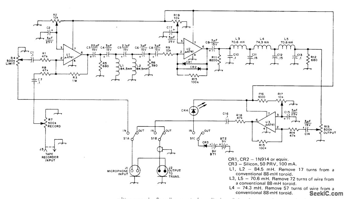 Installed between microphone and AF input connector of transmitter to increase averdge level of human voice and corresponding SSB transmitter output signal.Preamp U1 increases audio input level to over-come loss of following high-pass filter. Lowpass filter after logamp U2 eliminates all energy above about 2950 Hz. Last opamp U3 sets out.put level of processor for driving station transmitter properly. Overall amount of amplitude limiting is determined by setting of preamp gain control R4. Higffipass filter eliminates 60-Hz hum developed in audio system or in accessory equipment and reduces harmonic distortion generated by deeply pitched voice or by hum picked up from tape recorder or phone patch.Gain of opamp is determined by CR1-CR2, which give logarithmic response to audio input amplitude. Adjust R2, R17, and R19 for minimum distortion while applying 1-kHz sine wave to input.-R. Myers, A Quasi-Logarithmic Ana-Log Amplitude Limiter with Frequency-Domain Processing, QST, Aug. 1974, p 22-25 and 40.