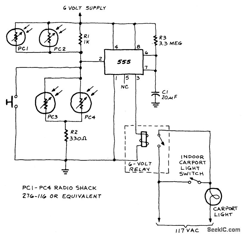 A 555 timer IC, operating in the one-shot mode, is triggered by light striking photoresistors. These normally have a resistance of several megohms but, in the pres-ence of light, that resistance drops to several hundred ohms, permitting current from the six-volt source to flow in the circuit. The R-C combination shown gives an on-time of about two minutes. Photoresistors PC3 and PC4 are mounted at heatlight-height. When headlights illuminate the photoresistor, the timer starts. That actuates a relay, RY1, and the lights are turned on. The lights are automatically turned off when the timer's two minutes are up.