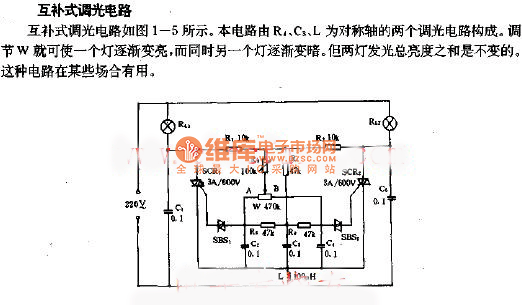 Complementary dimming circuitComplementary dimming circuit is shown in Figure 1-5, the circuit consists of two dimming circuit of which R1, C3, L are the axises of symmetry. W can be adjusted gradually to make a bright light, while the other light gradually dims. However, the total brightness of the two lamps is constant. This circuit is useful in certain situations.