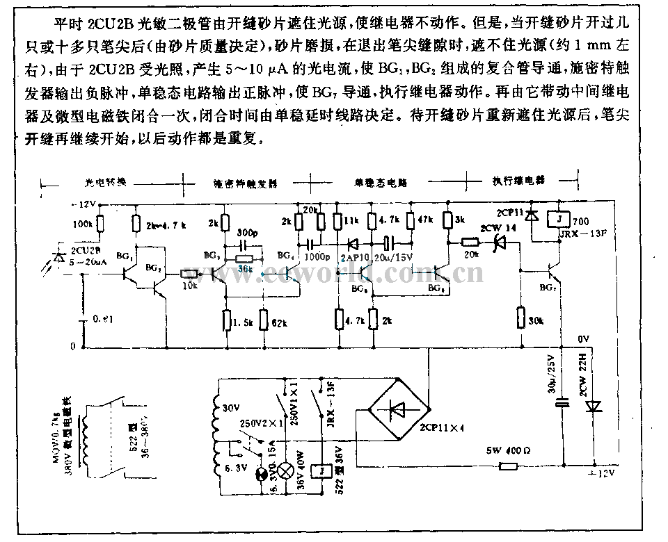Usually, 2CU2B photosensitive diode shuts out light source by slitting carborundum discs tomake relay failure to actuate. But, when slitting carborundum discs is open byseveralor tens of nib ( the number depends on the quality of carborundum discs) , carborundum discs arefret, when itaborts nib, it can not shut out light source ( about 1mm), because 2CU2B has light, it can generate 5~10µA light curret to makeB1, BG2 compositive clad pipe breakover, Schmidt trigger output negative impulse, monostable circuit output positive impulse and BG7 breakover, execution relay action. Then it can drive middle relay and miniature solenoid close once, and theclosed time depends on monostable delay circuit. After slitting carborundum discs shut out light source again, nib slitting continue start, and the action repeats.