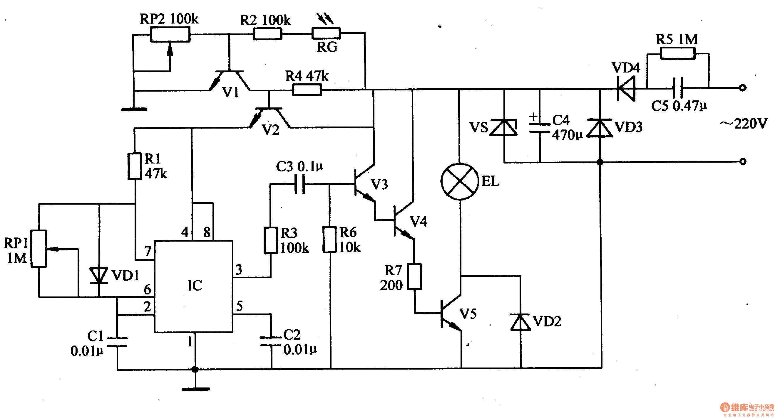 When it is in the daytime or there is light, RG's resistance value will become small. V1 will be connected and V2 will be disconnected. IC stops working because of lack of power.EL is not illuminated.