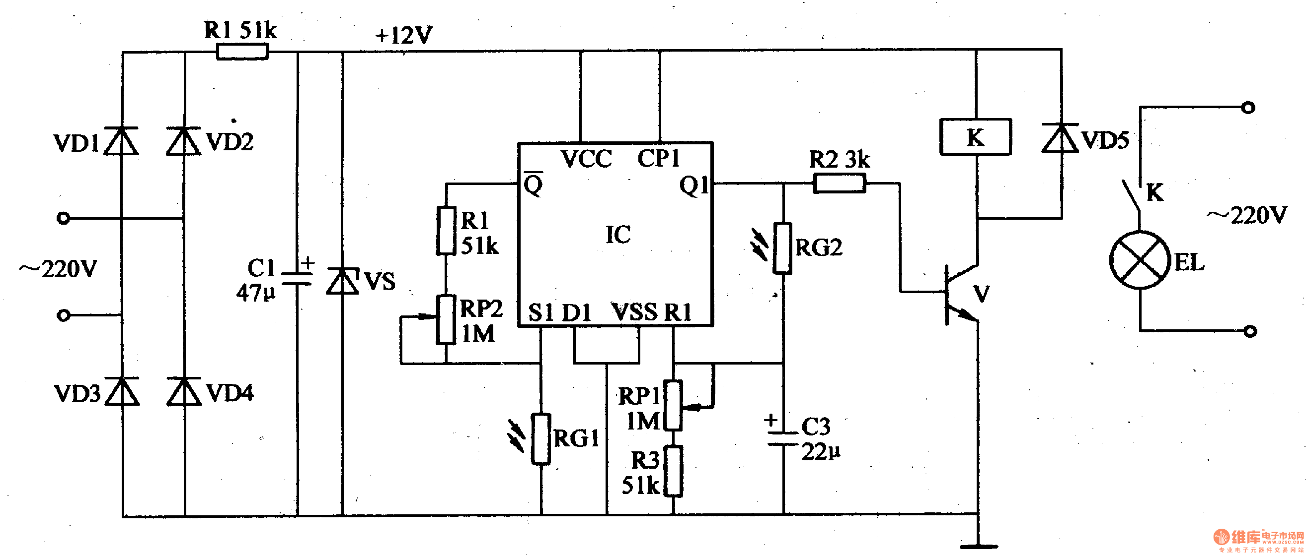 The 220v voltage will provide the light-operated circuit with +12v working voltage after rectification, filtration and stablization.