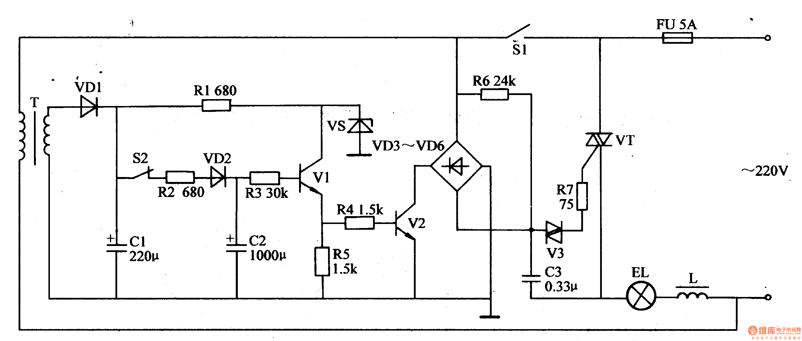 When S1 is connected, the 220v ac voltage will provide V1 with working voltage after it is reduced by T, rectificated by VD1, filtrated by C1, limited by R1, stablized by VS. The other circuit will charge C2 by S2,R2 and VD2, which will make V1 and V2 connected.Then V3's trigger voltage has a small phase angle. VT is connected in the ac electric's full period. EL will be illuminated.