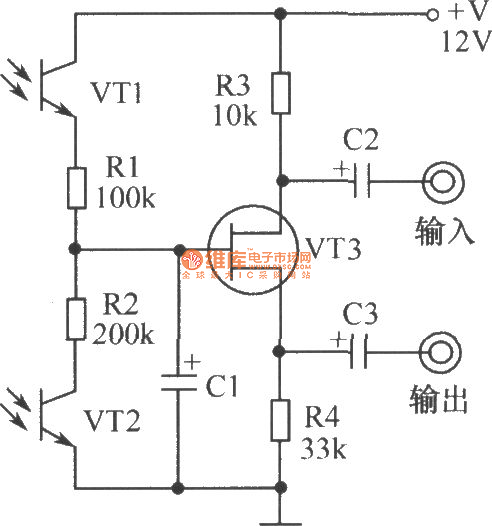 Light-operated potentiometer shown as the figure uses the laser pointer for light source to reflect light to photodiode VT1, then the channel resistance reduces, the volume increases; if the irradiation on VT2 reduces, the volume declines, therefore to achieve light-operated volume adjust. Every time you turning on the potentiometer, the VT3 tube's G potential is 0V, the channel resistance is in the maximum value, the volume will be kept the minimum value. The figure shows a mono, if you need to control multiple channels, you only need to connect FET G pole in parallel. The VT3 selects 3DJ6F or similar FET. VT1, VT2 is available to use commercial NPN photodiodes, C1, , C2 , C3 use 6.3μF/25V tantalum electrolytic capacitors. Resistor selects 1/8W metal film resistor.
