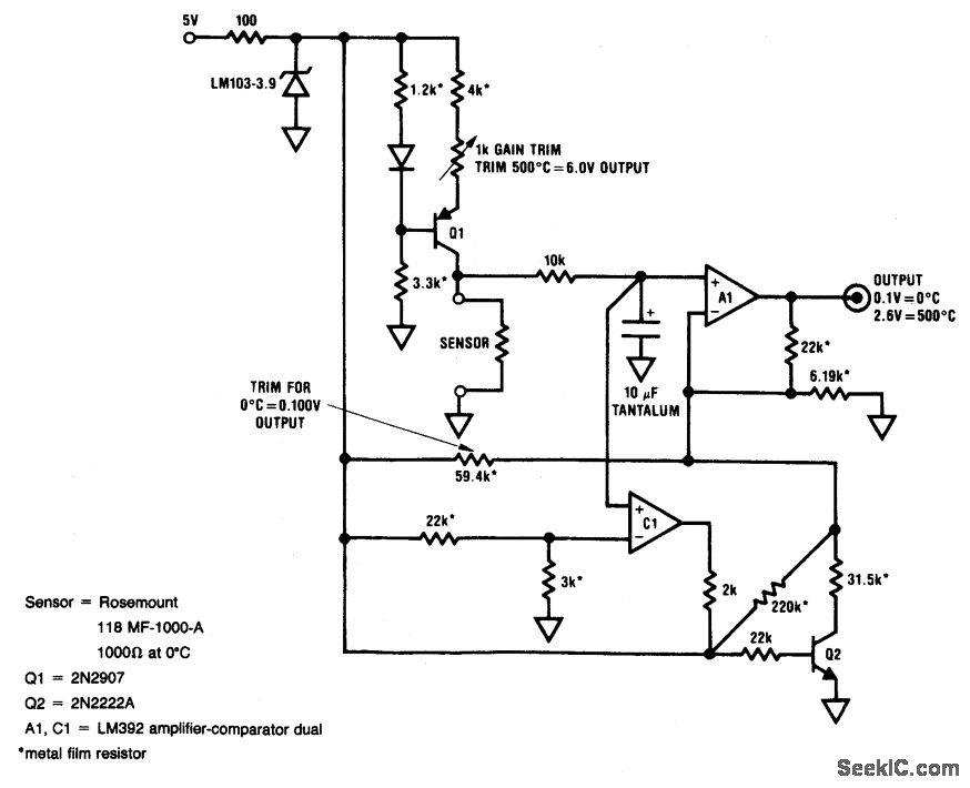 Fig. 13-43 In this circuit, an LM392 comparator/op amp (A1 and C1) is used to provide both gain and linearization for a platinum RTD in a single-supply thermometer, which measures from 0 to 500℃ with ±1℃ accuracy. To calibrate, substitute a precision resistance box for the sensor, adjust 0℃ for 0.10-V output (with the box set to 1000 ohms). Next, set the box to 2846Ω (500℃) and adjust the 1-kΩ gain trim for an output of 2.6 V. Repeat the adjustments until both zero and full-scale are fixed. National Semiconductor Linear Applications Handbook 1991 p 838.