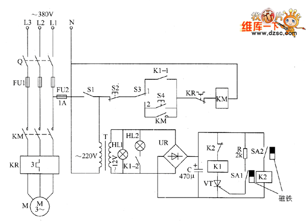 The liquid level automatic controller circuit is composed of the power supply circuit and level detection circuit control circuit, and it is shown as the chart. Power supply circuit is composed of the knife switch Q, fuses FU1, FU2, power switch S1, power transformer T, bridge rectifier UR and filter capacitor C. Liquid level detection control circuit consists of reeds SA1, SA2, relays K1, K0, thyristor VT, resistor R, AC contactor KM, thermal relay KR, control buttons S2, S4 and manual / automatic control switch S3. HL1 and HL2 are the power and working indicator lights.
