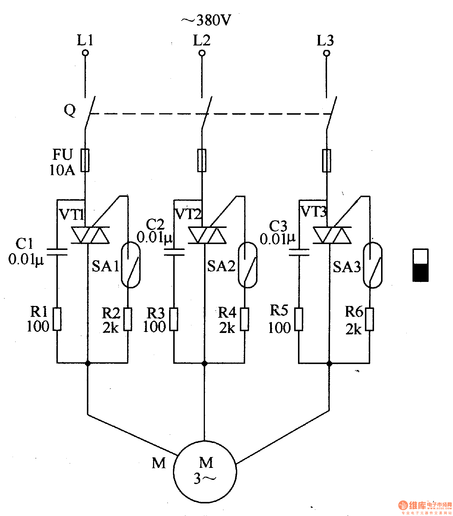 The loom saves electricity controller circuit is composed of knife switch Q, fuse FU, transistors VT1-VT3, resistors R1-R6, capacitors C1-C3, spring tubes SA1-SA2 and motor M, it is shown in the figure 8-20.