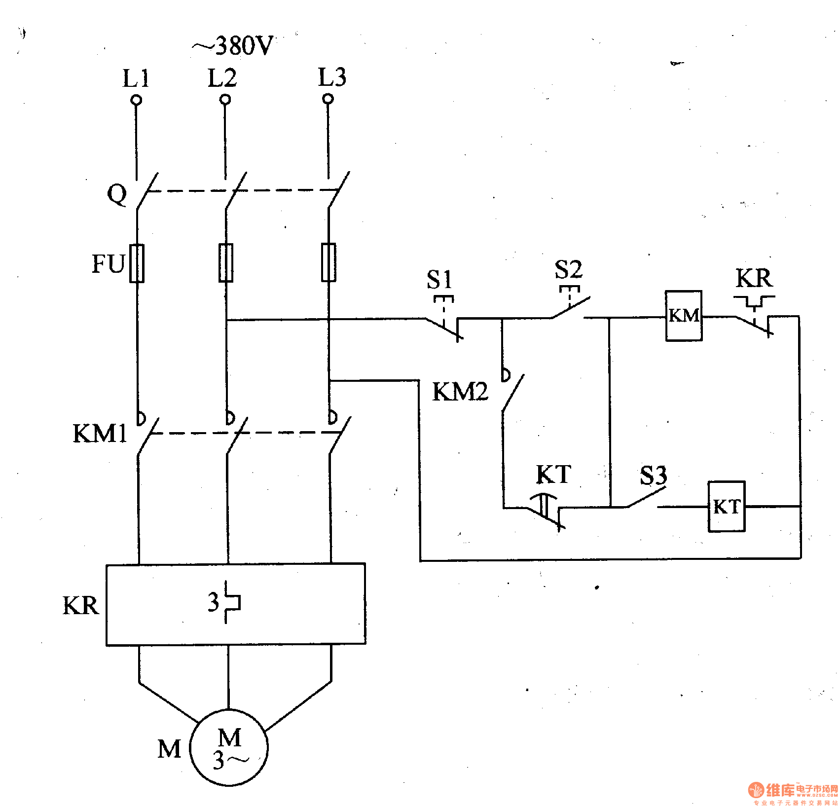 The loom saves electricity controller circuit is composed of knife switch Q, fuse FU, stop button S1, starter button S2, microswitch S3, time relay KT, AC contactor KM, heat relay KP and motor M, it is shown in the figure 8-21.