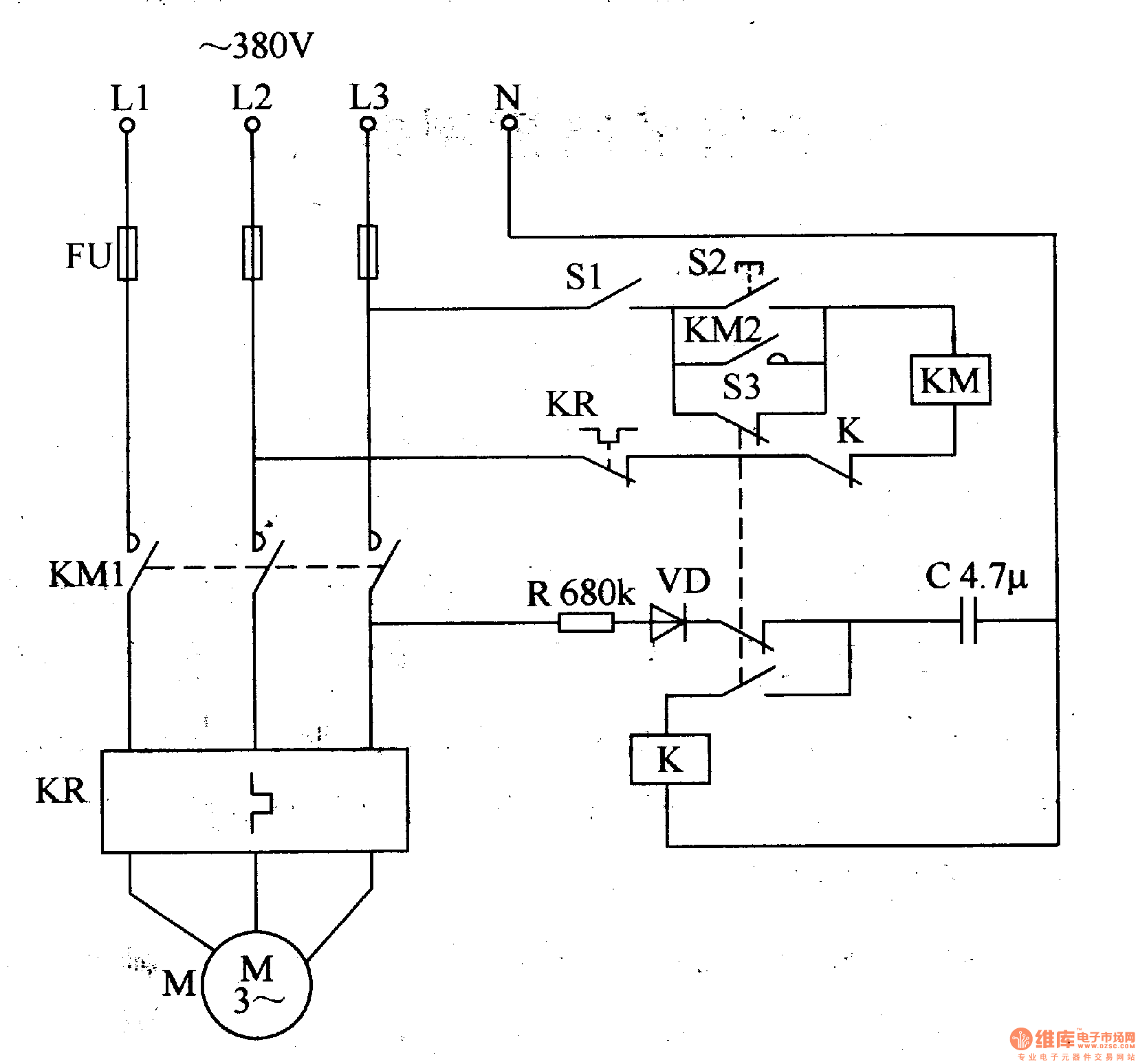 The loom saves electricity controller circuit is composed of control switch S1, starter button S2, AC contactor KM, heat relay KP, relay K, resistor R, capacitor C, rectifier diode VD and microswitch S3, it is shown in the figure 8-22.