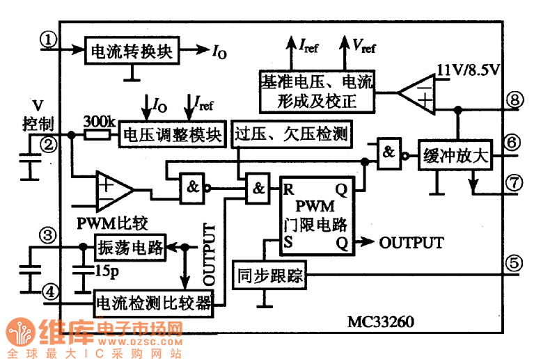 The MC33260 integrated circuit is composed of the reference voltage and current formation and correction circuit, the over-voltage and undervoltage detection circuit, the oscilation circuit, the current detection comparator, the current converter circuit, the voltage regulating circuit, the PWM comparative circuit, the synchronization tracking circuit, the buffer amplifier and other auxiliary circuit, the internal circuit block diagram is as shown in figure 9.