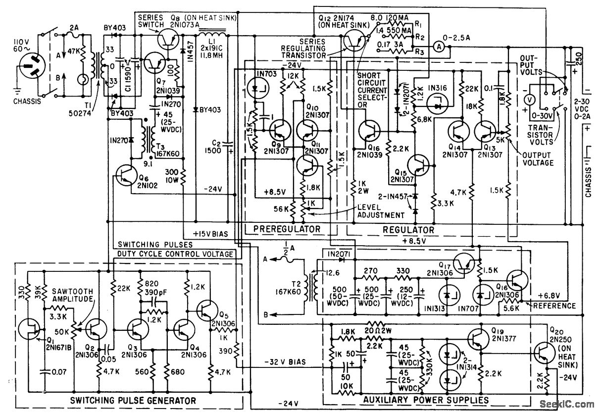 Regulation of short-circuit-proof variable voltage-regulated supply is 0.1 % for 2 to 30 V output and up to 2 amp. Dissipation in series regulating transistor is minimized by controlling on time of series switching transistor Q8. -J. S. Riordon, Power Supply Uses Switching Preregulation, Electronics, 35:10, p 62-64.