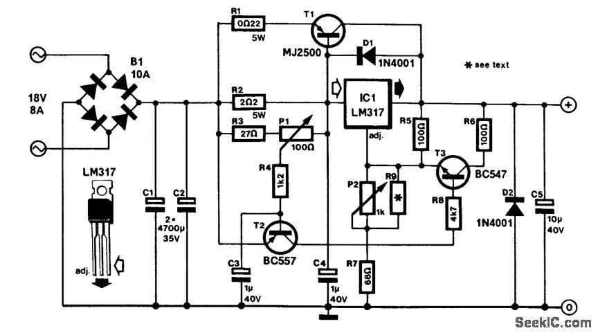 This circuit is intended as a revolution control for small dc motors as fitted, for instance, in small elec-tric drills (such as used for precision engineering and for drilling boards,among others). The behavior of these motors, which are normally permanent magnet types, is comparable to that of dependently pow-ered motors.In theory, the rpm of these motors depends solely on the applied voltage. The motor adjusts its rpm until the counter emf generated in its coils is equal to the applied voltage. There is, unfortunately, a drop across the internal resistance of the motor, which causes the rpm to drop in relation to the load. In other words, the larger the load, the larger the drop across the internal resistance and the lower the rpm.This circuit provides a kind of compensation for the internal resistance of the motor: when the urrent drawn by the motor rises, the supply voltage is increased automatically to counter the fall in rpm.The circuit is based on an enhanced voltage regulator that consists of IC1 and T1, which provides a easonably large output current (even small drills draw 2-to-5 A). The onset supply voltage, and thus the ram, is set by P2. Because of emitter resistance R1, the currents through IC1 and T1 will be related to one another in the ratio that is determined by R1 and R2. Owing to this arrangement, the internal short-circuit protection of IC1 will also, indirectly, provide some protection to T1.As soon as the current drawn exceeds a certain value, T2 will be switched on. This results in a base current for T3 so that R5 is in parallel (more or less) with R6. This arrangement automatically raises the output voltage to counter a threatened drop in rpm. The moment at which this action occurs is set by P1, so this circuit can be adapted pretty precisely to the motor used.If only very small motors are likely to be used, the power supply (transformer and bridge rectifier) can be rated more conservatively. As a guide, the current in the transformer secondary should be about 1.5 times the maximum dc output current.