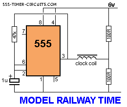 Here is a circuit that will convert any clock mechanism into Model Railway Time. For those who enjoy model railways, the ultimate is to have a fast clock to match the scale of the layout. This circuit will appear to make time fly by turning the seconds hand once every 6 seconds. The timing can be adjusted by changing the 47k. The electronics in the clock is disconnected from the coil and the circuit drives the coil directly. The circuit takes a lot more current than the original clock (1,000 times more) but this is one way to do the job without a sophisticated chip.