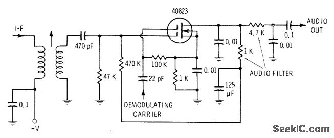 SSB IF signal is applied to one gate of MOSFET and demodulating carrier to other gate. Linear demodulation is obtained without distortion components. RC filter connected into drain circuit removes IF and carrier components, leaving de-modulated audio as output.-E. M. Noll, FET Principles, Experiments, and Projects, Howard W. Sams, Indianapolis, IN, 2nd Ed., 1975, p 154.