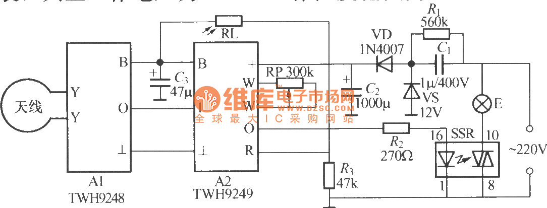 As the diagram shows,it is a automatic lamp which uses TWH9248/TWH9249 microwave emission and receiving sensor made in Guangdong Zhongshan Dahua electronics factory. It has the follow function: When the light at daytime or in room is strong, the lamp will not light up and when it is evening,the lamp will automatically light up.The annular antenna can use Φ3mm enameled wire to bend to Φ150mm circle and to connect to X,Y ports of A1. The circuit needs no debugging, and it can work well.