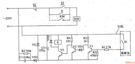 The mine locomotive remote controller circuit consists of transistors Vl-V3, capacitors Cl and C2, resistors Rl-R5, diodes VDl and VD2, control switch Sl and Zener diode VS, and the circuit is shown in Figure 8-35. Stop button S2, start button S3, AC contactor KM and normally open contact K form the main control circuit of the stepless rope motor M (it is not shown in the chart). VS, Cl, C2, R5 and VD3 form the integral power supply circuit, and the control switch S1 is installed in the duty room, and one end is grounded, the other end is connected to R1 by the leading wire.