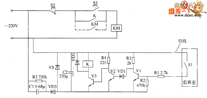 The mine locomotive remote controller circuit consists of transistors V1 ~ V3, capacitors C1 and C2, resistors R1 ~ R5, diodess VD1 and VD2, Zener diode VS and the control switch S1, and the circuit is shown as the chart. Stop button S2, start button S3, AC contactor KM and the normally open contact of K form the main control circuit of Stepless rope motor M (it is not shown in the circuit). VS, C1, C2, R5, and VD3 form the regulated power supply circuit, and the control switch S1 is installed in the duty room, then the one end is connected to the ground, and the other end is connected to R1 by wire. AC 220V voltage bucked by C1, rectified by VD3, filtered by C2 and stabilized by vs to provide 9V DC voltage for relay control circuit. R1 ~ R5 use 1/4W carbon film resistors or metal film resistors.