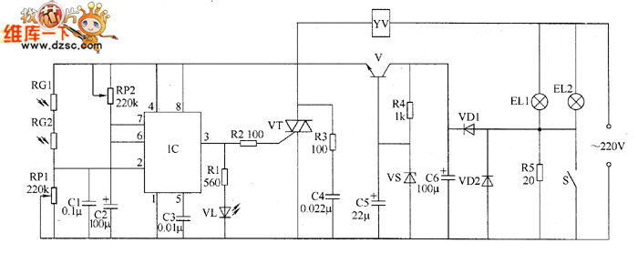 The mine spray dedusting controller circuit consists of +6 V power supply circuit, light control circuit, LED indication circuit and the solenoid valve control circuit, and the circuit is shown as the chart. +6 V power supply circuit consists of the illuminating lamps EL1, EL2, resistors R4, R5, switch S, diodes VD1, VD2, filter capacitors C5, C6, Zener diode V and transistor VS. Light control circuit consists of the photosensitive resistors RGI, RG2, potentiometers RP1, RP2, capacitors C1 ~ C3 and the time-base integrated circuit IC. Solenoid valve control circuit is composed of the internal circuit of IC, resistors R2, R3, thyristor VT, capacitor C4 and electromagnetic valve YV. LED indicating circuit is composed of the resistor R1 and LED VL. R1 and R4 select 1/4W metal film resistors; R2 uses 1W film resistor.