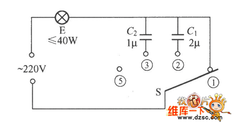 Capacitive dimmer switch circuit is as shown. It uses the principle of capacitance of capacitors for AC. When the S is at the shown position, bulb E normally lights with the maximum brightness. When it is dialed to position ②, light intensity of E decreases because of the insert of 2μF capacitor C1 in series. When it is allocated to the position ③, the brightness is reduced with a block because of increasing capacitance cause by C2 <C1. And when it is allocated to the position ④, the light E is off. C1 and C2 should use non-polar oil paper capacitor which can endure more than 400V voltage. And S is the 1 × 4 single-pole four-throw switch.