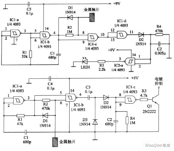 The circuit shown in the figure only uses a touch metal chip,the circuit uses two forty-two input terminals(internal has four identical, with two input terminals) schmitt trigger 4093(such as CD4093,TC4093 etc.).Usually the output terminal's 3 pin of IC2-a is low,light-emitting diode LED1 can not shine,when touching metal chip, the output terminal changes into high level to make the LED1 turn and light.