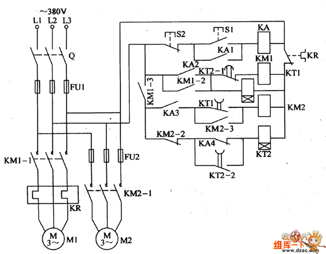 For the straw feed muller used in the countryside to process the corn, straw and grass and other animal feeding stuffs, some people use two electric motor (feeding motor and cropping motor) as the power to complete the crushing job for straw and feed. To avoid the cropping motor's rotor locking, it is required that the cropping motor should run firstly for a period time, and then lets the feeding motor run. The straw feed muller control circuit introduced by this model can control the two motors' woking status automatically.The circuit's working principle is shown below.This straw feed muller control circuit is made up by knife switch Q, fuse FU1, FU2, thermal relay, AC connector KM1, KM2, time relay KT1, KT2, middle relay KA and control button S1, S2 and so on, which is shown in the picture.The cropping motor M1's main circuit is made up by Q, FU1, KM1's normally open main contactor KM1-1, KR thermal elements.The feeding motor M2's main circuit is made up by Q, FU1, FU2 and KM2's normally open main contactor KM2-1.The control circuit is made up by start button S1, stop button S2, KA, KM1, KM2, KT1, KT2 and other control contactors.