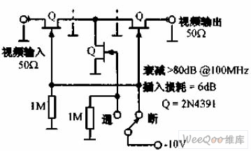 Video switch circuit is as shown. 2N4391 FET provides the circuit with only 30Ω induction -resistance and less than 0.2pF pinch-off is capacitance. This performance can be comparable with that of the ideal high-frequency switch. The attenuation for 100MHz circuit is more than 80dB and the insertion loss is about 6dB.