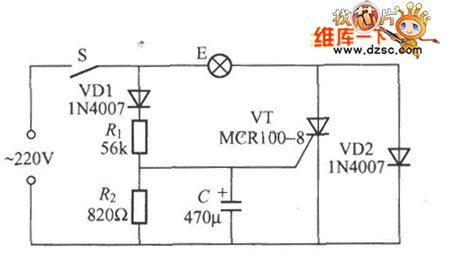 Incandescent light’s filament is with large thermal resistance and very small cold resistance. So at the moment of opening light, the impact current flowing through the filament is very large. It can be very easy to make the filament burn within damages. Life extension’s switch can be a good solution to this problem, just as shown in the figure.It can effectively extend lamp’s life greatly. When switch S is connected, the voltage across the capacitor can not change suddenly and the voltage across C is zero. The thyristor VT deadlines without triggering voltage. At this moment, the current flowing through the bulb E is the half-wave current rectified by VD2. The light bulb is pre-heated with darkness and the inrush current is very small.