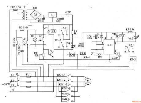 This motor protector circuit is composed of DC steady voltage power supply, phase sequence detection circuit, sampling control circuit and automatic converting circuit, it is shown in the figure 8-38.
