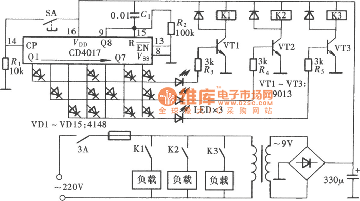 Published:2011/7/22 5:26:00 Author:Sue | Keyword: Multi-channel Multi-state Control Switch Composed of CD4017 | From:SeekIC