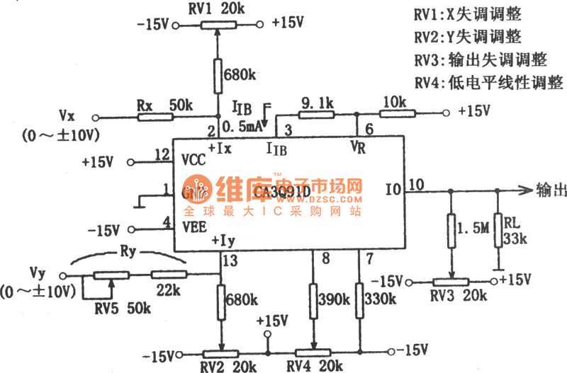 The picture shows the multiplying circuit composed of CA3091. When Rx=50kΩ,Ry=33kΩ, RL=33kΩ, IIB=0.5mA, K= 1/10, the output voltage Vo=VxVy/10.
