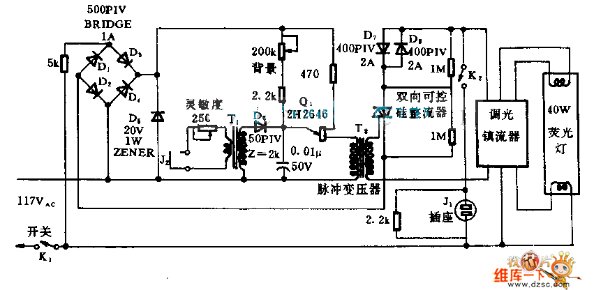 The circuit can drive 10 pieces of 40W fluorescent lamps. When K2 is closed, the brightness of the light will change the audio signal amplitude.Because fluorescent lamp has not the time delay effect like incandescent lamp, the music can control the light of dance hall accurately and timely.