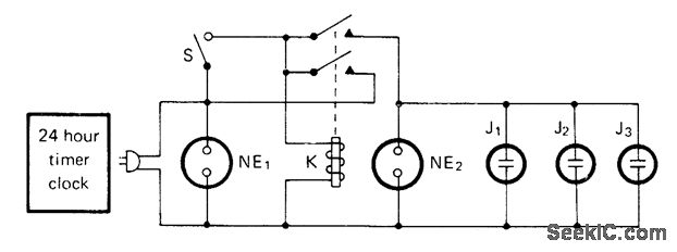 Prevents doublecharging if someone forgets to turn off 24-h time clock after recommended 16-h charge period. Nicad devices with built-in chargers are plugged into jacks J1-J3, and timer dial is advanced until clock switch is triggered. Neon lamp NE1 should now come on. Momentary pushbutton switch S is pushed to energize relay K and start charge, When timer goes off, K releases to end chatge.-M. Katz, Battery Charge Monitor, CQ, July 1976, p 27.