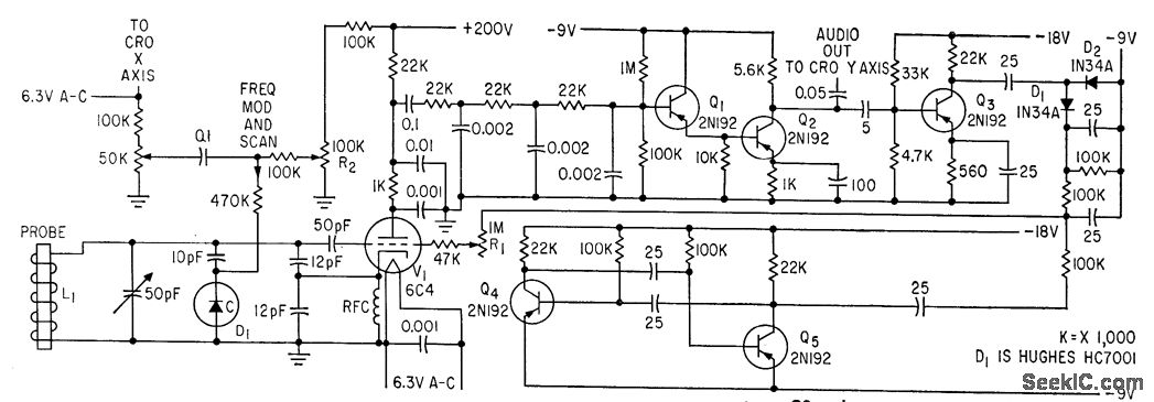 Temperature telemeter depends on absorption of r-f energy by chlorine molecule in proportion to temperature. When spectrometer oscillator V1 is tuned to frequency of correct absorption line, each oscillator pulse sets up oscillations in probe that last long enough to affect starting voltage for next oscillator pulse. After plate detection and low-pass filtering to suppress quench frequency, signal goes to two-stage a-f amplifier Q1-Q2, whose output to cro indicates whether spectrometer is on nuclear resonance frequency.-C. Dean, Using Nuclear Resonance to Sense Temperature, 33:28, Electronics, p 52-54.