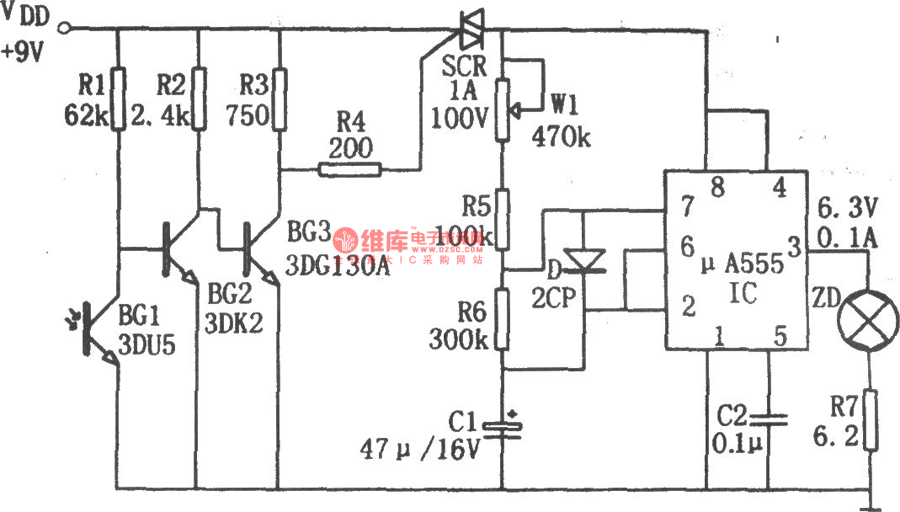 BG1(3DU5) in the photoelectric switch is photosensitive triode which has different resistance value under different light. In the daytime, it has a low resistance value because of the light which will make BG2 disconnected and BG3 will be connected. The silicon controlled rectifier SCR is disconnected and the oscillator doesn't work because of lack of electricity, and the pilot light is not illuminated. In the nighttime, BG1 will have high resistance value between c and e, which will make BG2 connected and BG3 will be disconnected. SCR is connected and the corresponding oscillator begins to work because the power circuit is connected. Its output signal will drive the pilot lamp ZD to illuminate which will draw people's attention. By adjusting W1, striking flash light interval can be achieved.