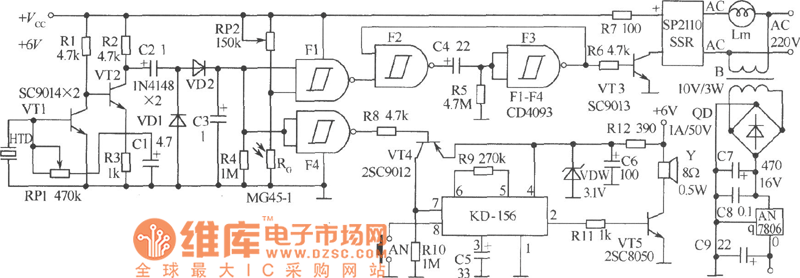 The door light switch that is installed outside the door is always opened and closed by other people, so it is very easy to be damaged, therefore we make the novel door light switch. This door light switch is the knock type, and it has the function of doorbell. The circuit is as shown in the figure, it is composed of the knock detection circuit, the door light trigger and delay control circuit, the doorbell circuit and the power supply circuit.etc. The F1~F4 use the CD4093 digital integrated circuit. The music integrated circuit uses the KD-156. The VT1 and VT2 use the audion SC9014; the VT3 uses the audion SC9013; the VT4 uses the 2SC9012; the VT5 uses the 2SC8050.