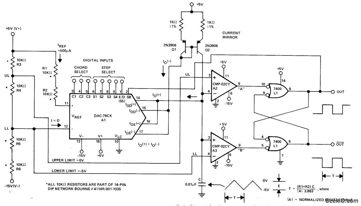 Digital inputs from mioroprocessor to Precision Monolithics DAC-76CX 8-bit companding D/A converter provide 8159:1 frequency range for AF oscillator, from 2.5 to 20,000 Hz. DAC functions as programmable current source that altemately charges and dischatges capacitor between precisely controlled upper and lower limits. Since both limits are derived by dividing power supply volt ages, frequency is independent of changes in supply voltage.Design equations are gtven.-D.Soderquist, Exponential Digitally Controlled Oscillator Using DAC-76, Precision Monolithics, Santa Clara, CA, 1977, AN-20, p 1.