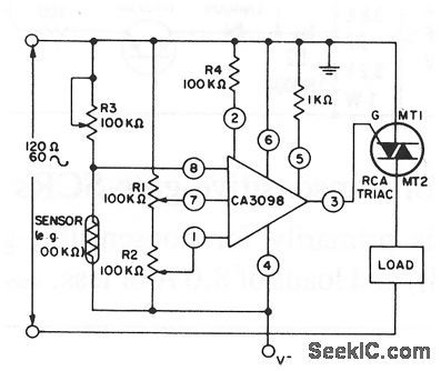 This circuit shows control of a triac with a CA3098 programmable Schmitt trigger. R1 and R7 set the low and high reference voltages, respectively, while R3 sets the control-signal level from the sensor.
