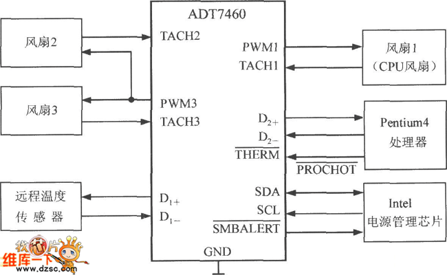 The Pentium 4 computer's thermal dissipation control circuit is shown in the picture. In this computer it all uses three thermal-dissipation fans. Among them, the first fan is special for the CPU's thermal dissipation. The second fan and the third fan are installed separately in the computer's front side and back side for the box's thermal dissipation. The VT is the the first channel's remote temperature sensor which is used for measuring the environment temperature. The temperature sensor in Pentium 4 CPU is used as the second channel remote temperature sensor. The ADT7460 would be connected to the power management chip produced by the Intel company through the SMBus bus. Once it has detected the over-temperature case, it would output the over-temperature interrupt signal from the ports. And then by the power management chip it would make the CPU generate a interrupt.