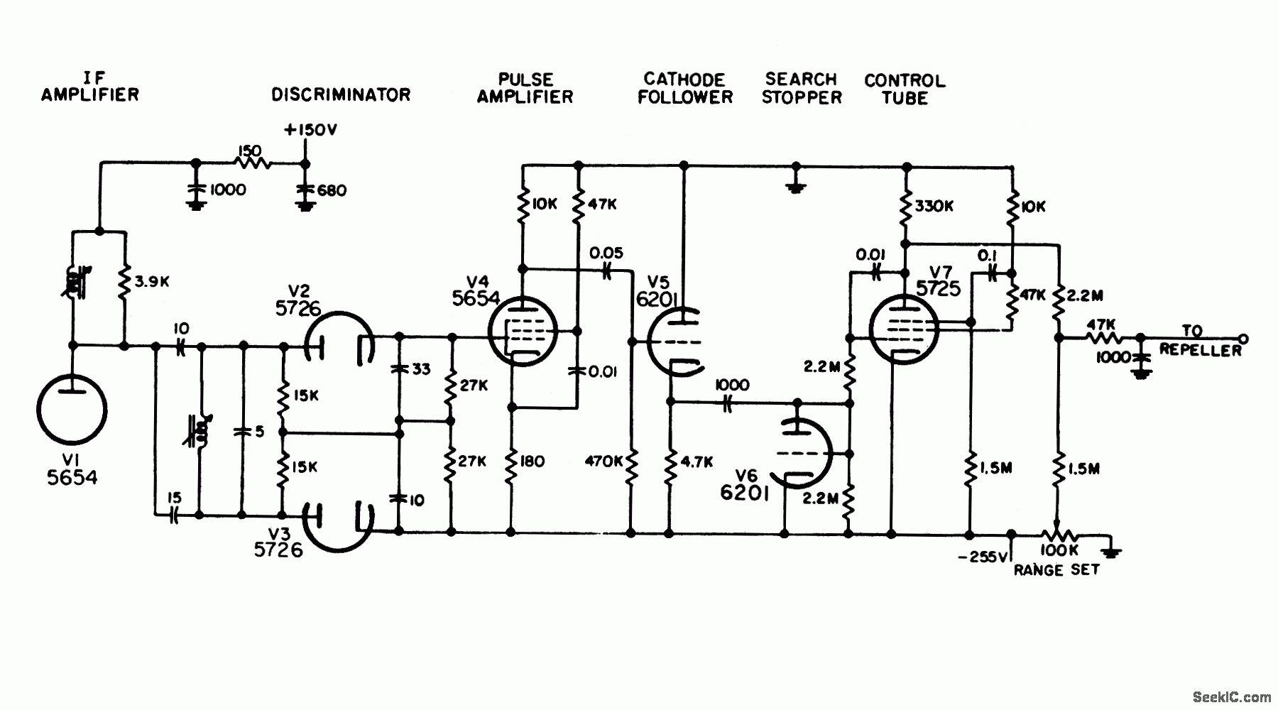 Pentode is astable phantastron during radar search, and d-c amplifier during lock-on when pentode furnishes direct control of klystron repeller.-NBS, Handbook Preferred Circuits Navy Aeronautical Electronic Equipment, Vol. 1, Electron Tube circuits, 1963,p N13-6