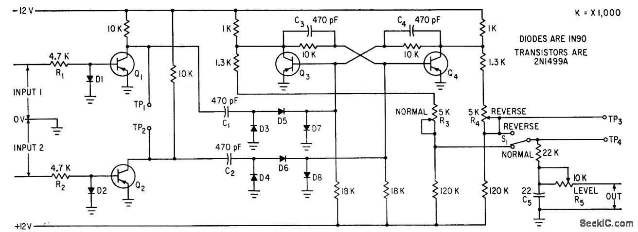 Measures phase difference between two sinusoidal inputs. Each limiter (Q1 and Q2) drives one side of high-speed flip-flop Q3-Q4 through differentiating and clipping circuits, giving square wave that turns on when one input signal goes negative and turns off when other input goes negative. D-c value of output voltage is proportional to phase difference, with about 11 V corresponding to 360°.-J. R. Woodbury, Measuring Phase with Transistor Flip-Flops, Electronics, 34:38, p 56.