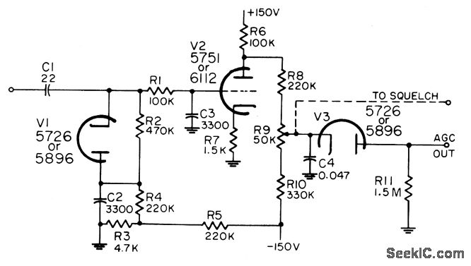 Furnishes bias voltage for r-f and i-f stages of receiver, to minimize changes in output volume as input signal fades or as receiver is tuned to station having different signal strength. Additional output controls squelch tube that suppresses background noise in absence of input signal. Maximum i-f input is 7 v rms. Maximum d-c output level is -27 v for miniature tube and -35 v for subminiature.-NBS, Handbook Preferred Circuits Navy Aeronautical Electronic Equipment, Vol. I, Electron Tube Circuits, 1963, PC 63, p 63-2.