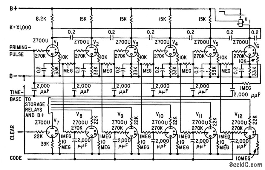 Coincidence of incoming code with reference pulse causes cold-cathode code tubes to fire in accordance with binary number present, for driving display panel containing eight sections each having 30 miniature fucrescent lamps.-T. S. Pick and A. Roadman, Photoelectric Scanners Control Bus traffic, Electronics, 32:28, p 50-,51.