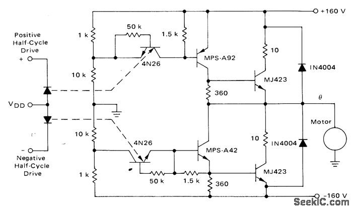 Power stage using Motorola 4N26 optoisolators and push-pull transistors drives fractional -horsepower single-phase AC motor over speed range of 5% to 100% of base speed. Input drives are provided by pulse-width modulation inverter using stored program in ROM to generate sine-weighted pulse trains to provide variable-frequency drive.-T. Mazur, ”ROM-Digital Approach to PWM-Type Speed Control of AC Motors,”Motorola, Phoenix, AZ, 1974, AN-733, p12.