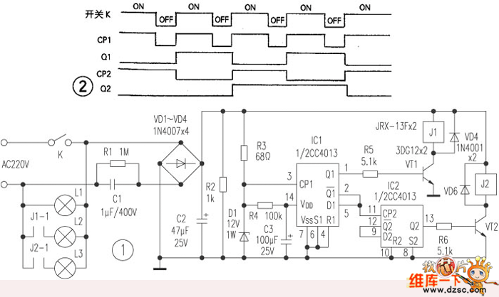 The packet control circuit of chandelier is as Figure 1 shown, the function is as follows: when the power switch turned on, l1 group of lamp light; when the power switch turned on again, l1 and l2 group of lamp light; then the power switch still turned on, l1 and l3 group of lamp light; fourth operation, l1,l2 and l3 group of lamp light. If we continue to operate, the lanterns will be light over the order cycle again.